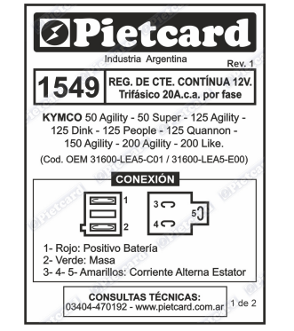 1549 REGULADOR KYMCO 50/125/150/200 AGILITY TRIF. 20 A